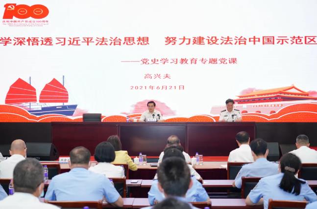 6月21日,高兴夫副省长到我校为师生上党史学习教育专题党课,宣传贯彻习近平法治思想。省司法厅党委委员、院党委书记顾金法主持报告会。
