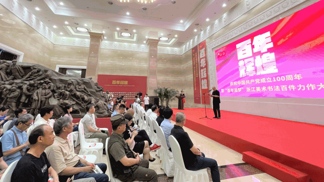 6月29日上午,百年辉煌——庆祝中国共产党成立100周年暨“百年追梦”浙江美术书法百件力作大展在浙江展览馆隆重启幕,以文艺形式展示党的百年芳华。