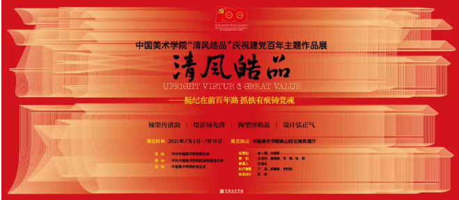 中国美术学院“清风皓品”庆祝建党百年主题作品展于7月6日上午在中国美术学院南山校区南苑展厅开幕。正值全党全国深入学习宣传贯彻习近平总书记在庆祝中国共产党成立100周年大会上的重要讲话精神之际,学校隆重推出“清风皓品”庆祝建党百年主题作品展,这是庆祝建党百年的生动艺术表达,也是一堂别具“国美味”的廉洁党课。