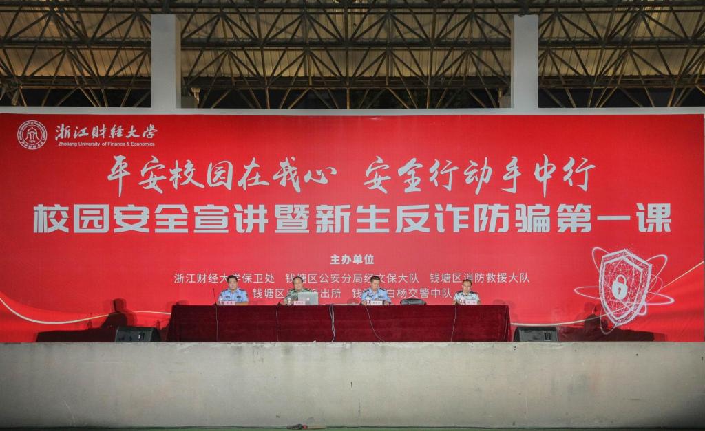 9月7日,学校联合杭州市公安局钱塘区分局经文保大队、消防救援大队、白杨派出所、白杨交警中队开展了校园安全宣讲暨新生反诈防骗第一课活动。4000余名新生参加活动。