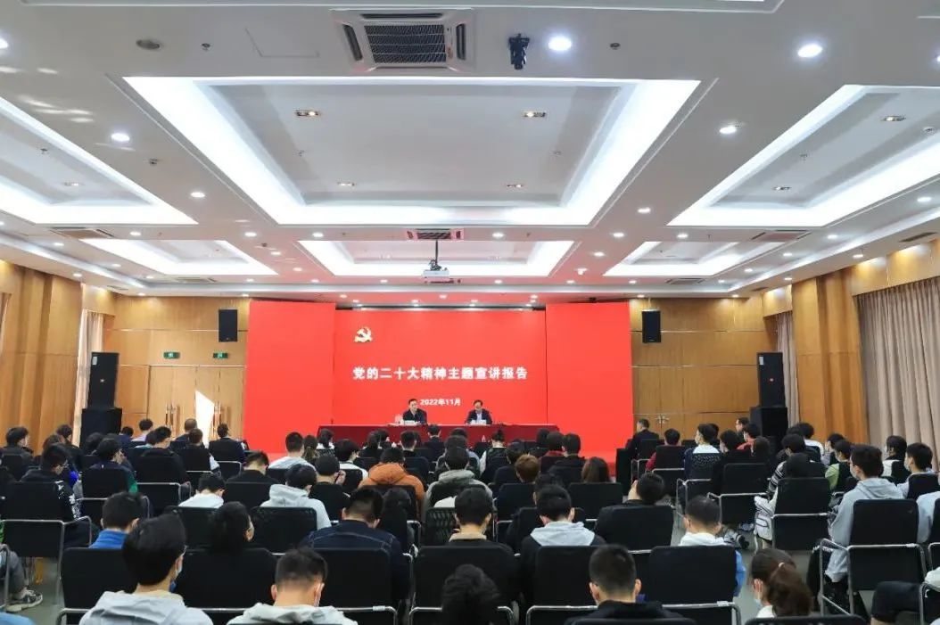 11月24日下午,校党委书记李明在萧山校区B201教室宣讲党的二十大精神。宣讲会由学生工作部副部长金璐主持。