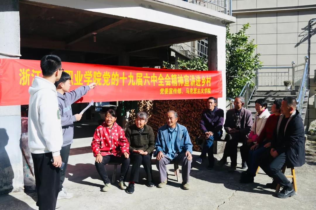 11月25日,在学校文明结对的淳安县瑶山乡幸福村,浙江金融职业学院校党委委员、宣传部长张鹏超用接地气的语言给村民宣讲十九届六中全会精神。