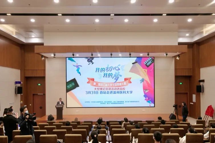 3月31日下午,“我的初心•我的梦”第二届浙江省大学生短视频大赛大型理论宣讲活动首站走进温州医科大学。校党委书记吕一军教授作题为《守护大健康 同奔共富路——温州医科大学走好共同富裕健康路的生动实践》的主题宣讲。校党委副书记程锦国致辞,校党委委员、宣传部(教师工作部)部长李军红,浙江广电集团融媒体新闻中心(浙江卫视新闻中心)副主任余云,浙江广电集团著名评论员舒中胜出席活动。