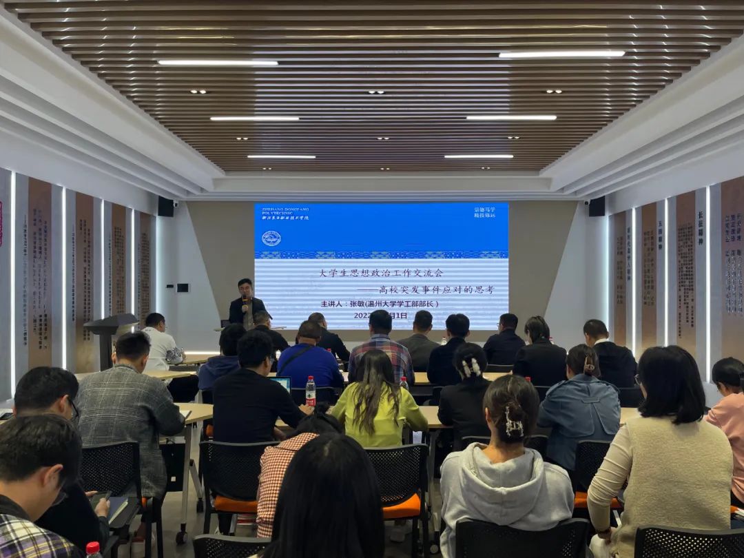 为提升我校辅导员应对学生突发事件的防范与处理能力,进一步加强辅导员队伍建设,2022年11月1日下午,在瓯江红党群服务中心召开大学生思想政治工作交流会。学生工作部特别邀请温州大学学工部部长张敏为一线辅导员开展”关于高校突发事件应对的思考“专题讲座。校党委委员、副校长贺文华,二级学院副书记、班主任代表以及全体辅导员参加,会议由学工部部长张海生主持。