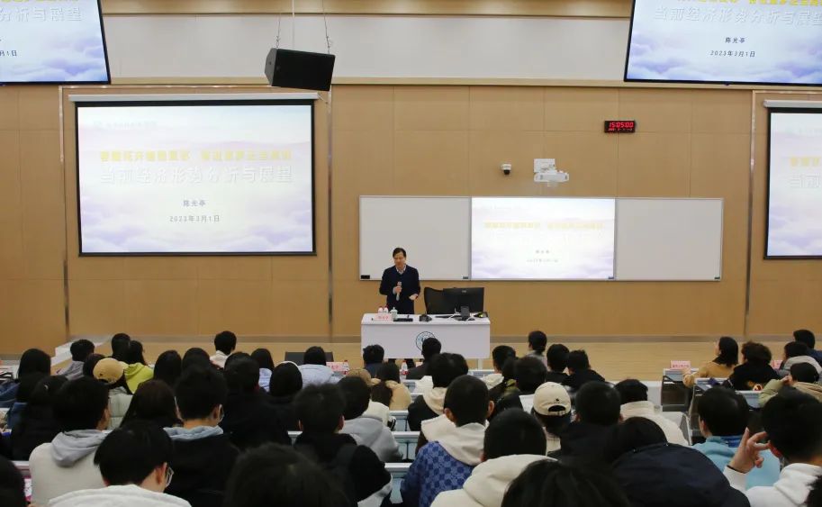 3月1日下午,校长陈光亭以《春暖花开蓬勃复苏 奋进逐梦正当其时——当前经济形势分析与展望》为题,在南浔校区给来自八个二级学院的近300名学生代表讲授2023年春季学期“开学第一课”,与大家畅谈当前经济形势,为同学们的发展指点迷津。开学第一课由校党委副书记吴小英主持。