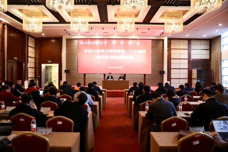3月22日上午,校党委书记何瑶伟在中层干部学习贯彻党的二十大精神集中轮训班上作题为“学深悟透党的二十大精神,扎实推动商院跨越式发展”的辅导报告,会议由党委副书记应金萍主持。