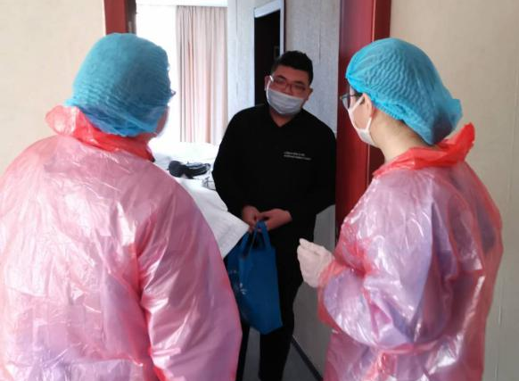 4月30日,学工部、团委党支部许栋书记带队,前往学校招待所看望我校正在接受隔离的11名同学,自发捐助经费,为隔离的同学购置生活必需品。