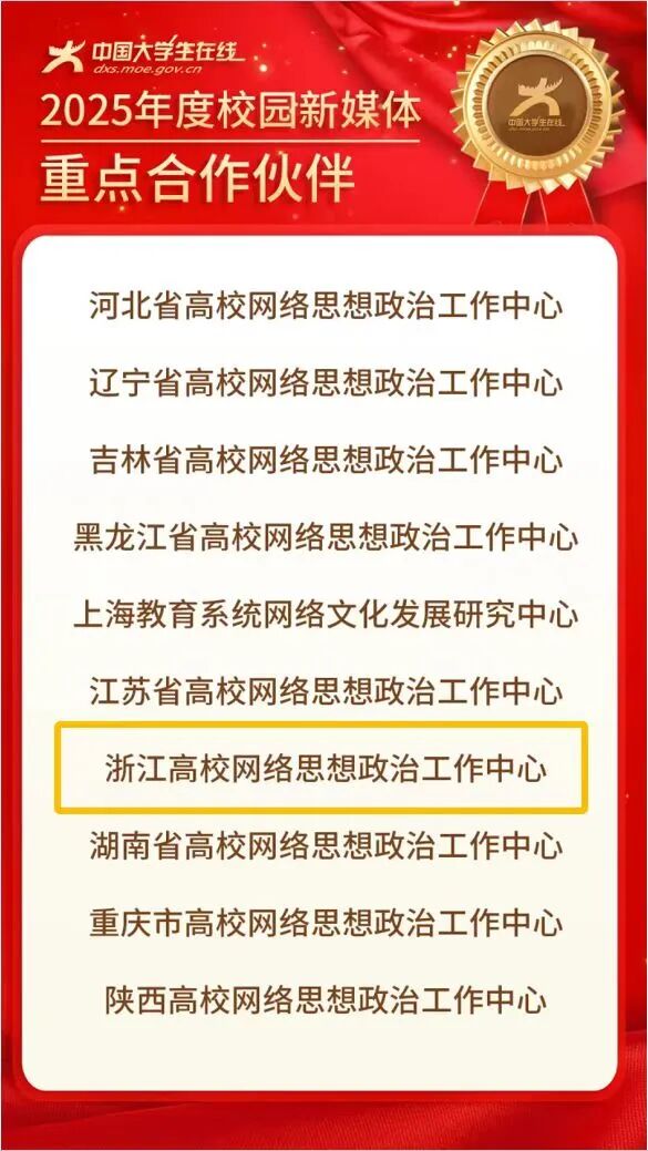 近日,教育部中国大学生在线公布了2025年度校园新媒体表彰名单。浙江省高校凭借扎实的工作和突出的表现,斩获多项荣誉,充分展现了浙江省高校网络思政工作的活力与成效。