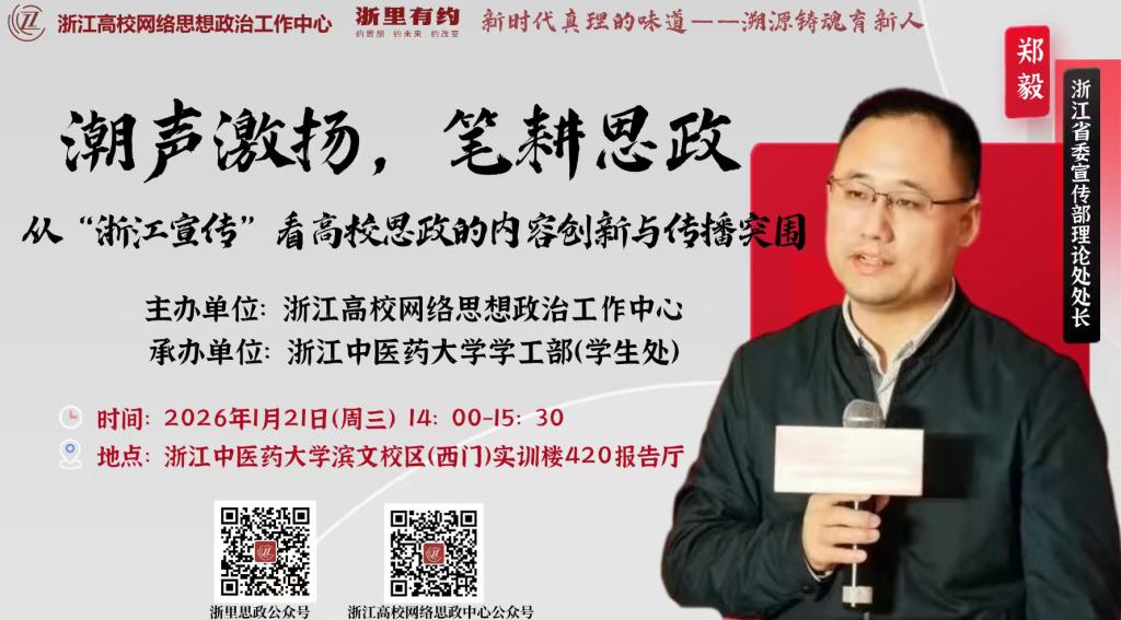 2026年1月21日下午,“浙里有约”名师讲堂系列第三讲在浙江中医药大学顺利举行,全国人大代表、浙江中医药大学原党委书记黄文秀,浙江中医药大学党委副书记、统战部部长黄爱军,浙江中医药大学党委委员、宣传部部长马重阳出席活动。