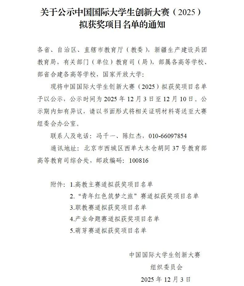 12月3日,中国国际大学生创新大赛(2025)拟获奖项目名单公示。浙江高校共265个项目拟获奖,同时,浙江6个中学生项目在萌芽赛道入围总决赛。